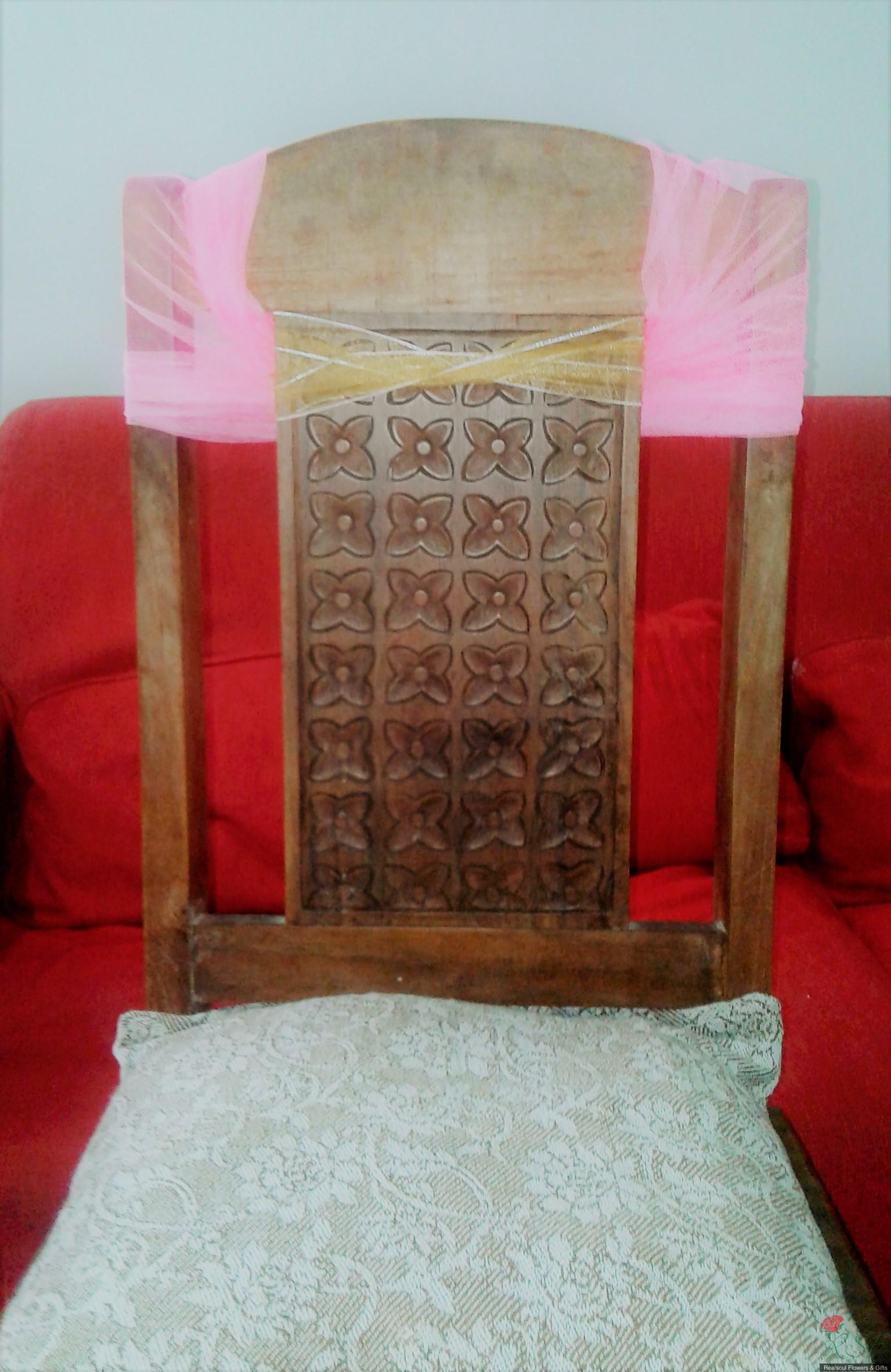 Weddings: In this demonstration sample, the wedding chair back decor is especially designed for a wooden chair without hood (cover) or seating skirting in place. It is a simple design, yet elegant and the fabric we let it flowing to the floor or short. In this design the price is for the fabric run low to the ground, not short. However, the decor can be used for plastic chairs as well. Available in Malaysia ONLY.