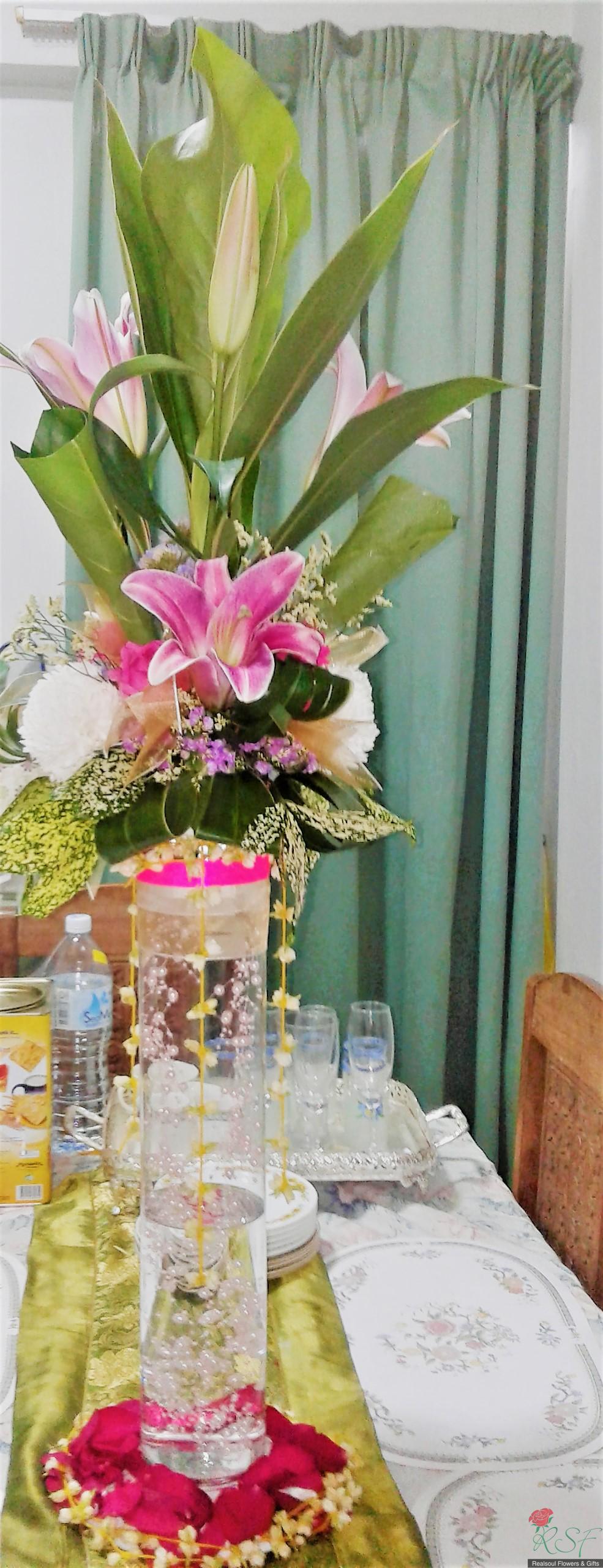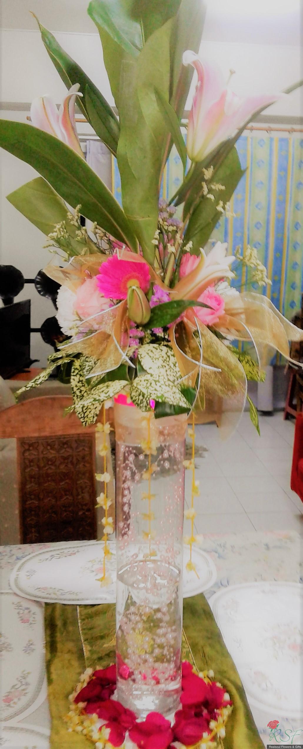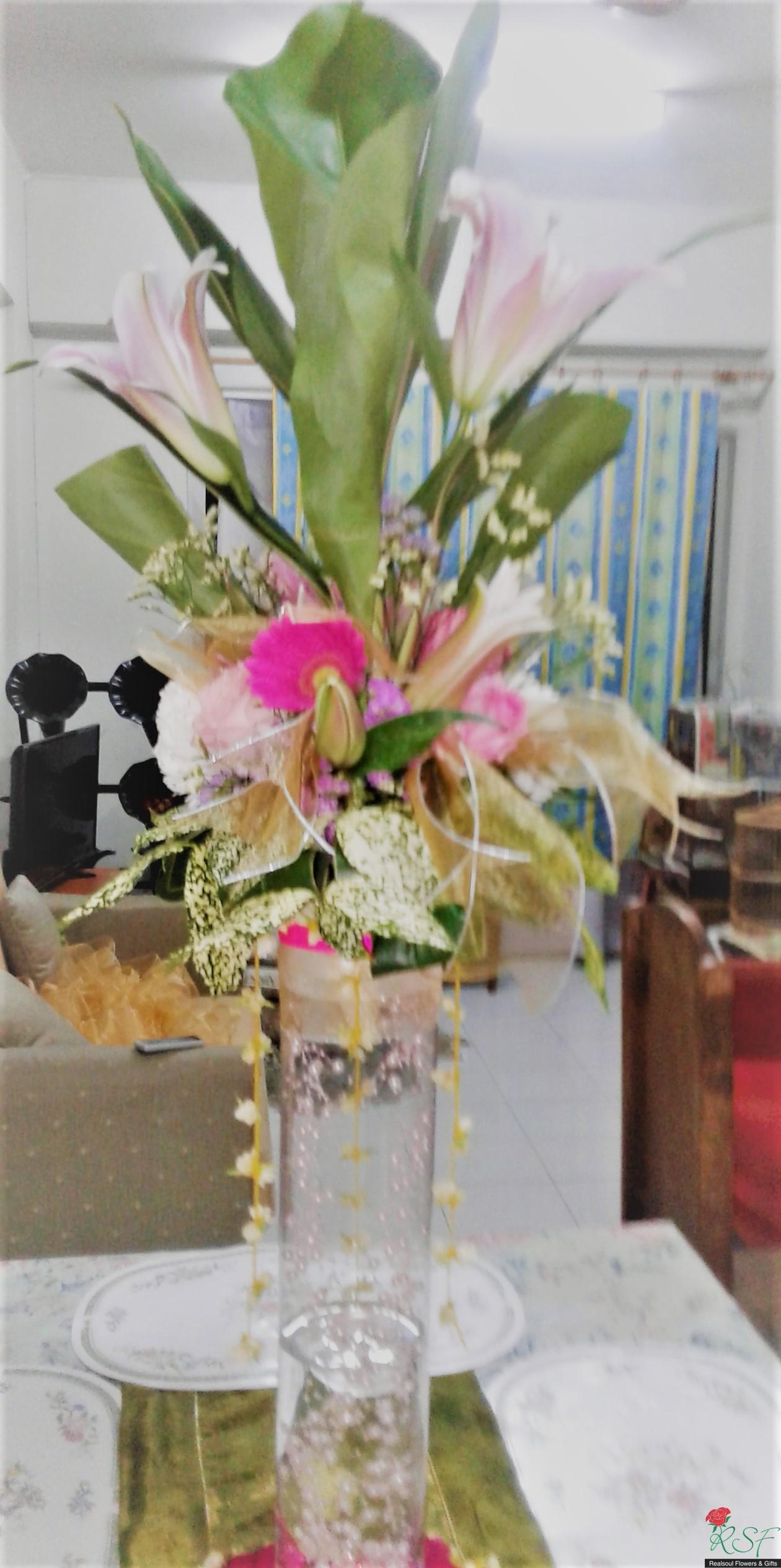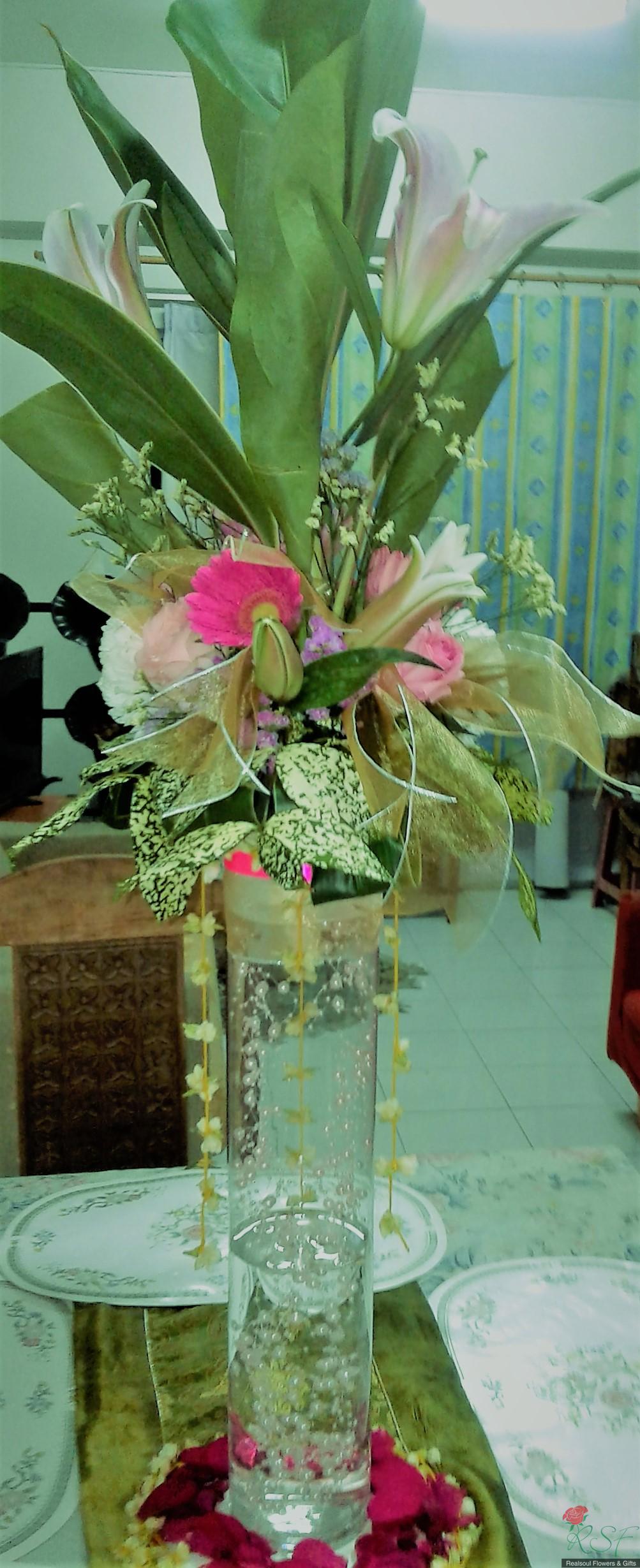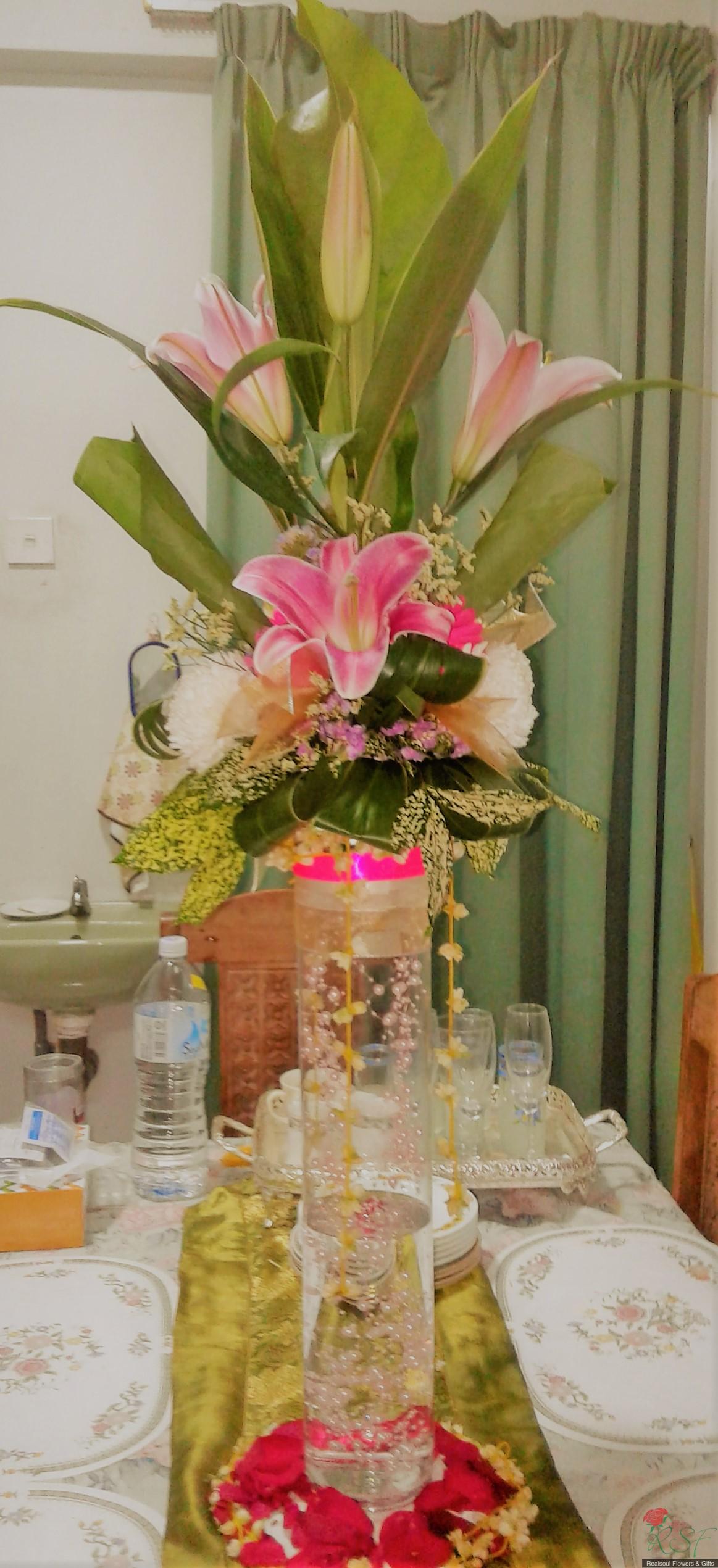 Weddings: This wedding tall centrepiece is unique in that the total height of the whole arrangement is more than 100cm. Sitting in a cylindrical acrylic glass container of 50 cm height, this design consists of lilies, roses, gerbera daisies, chrysanthemums, jasmine strings, statice, caspia, and three kinds of foliages. The container is enhanced by decorative shiny pearls strings, as well as the base is surrounded by red rose petals and stringed jasmines. This exquisite piece is suitable for high ceilinged reception room or hotel ballroom. This design can be for sale or rental. It is priced at RM295 and rental is at 30% lower than original price and containers and enhancers will be taken back leaving the flowers behind.