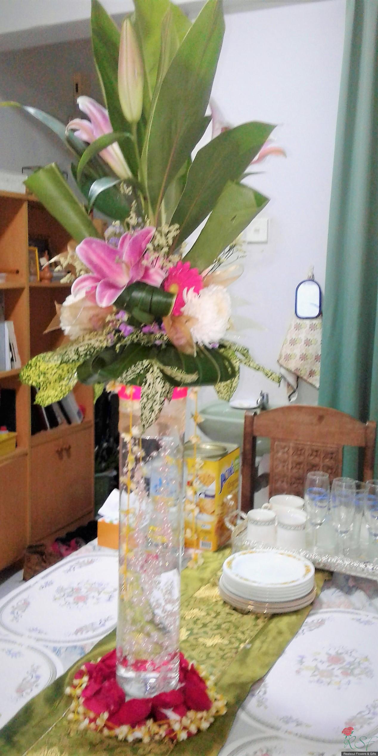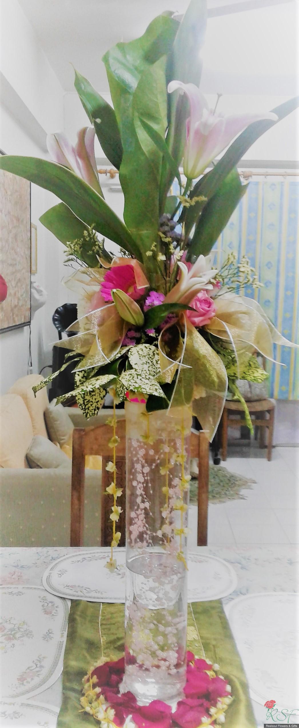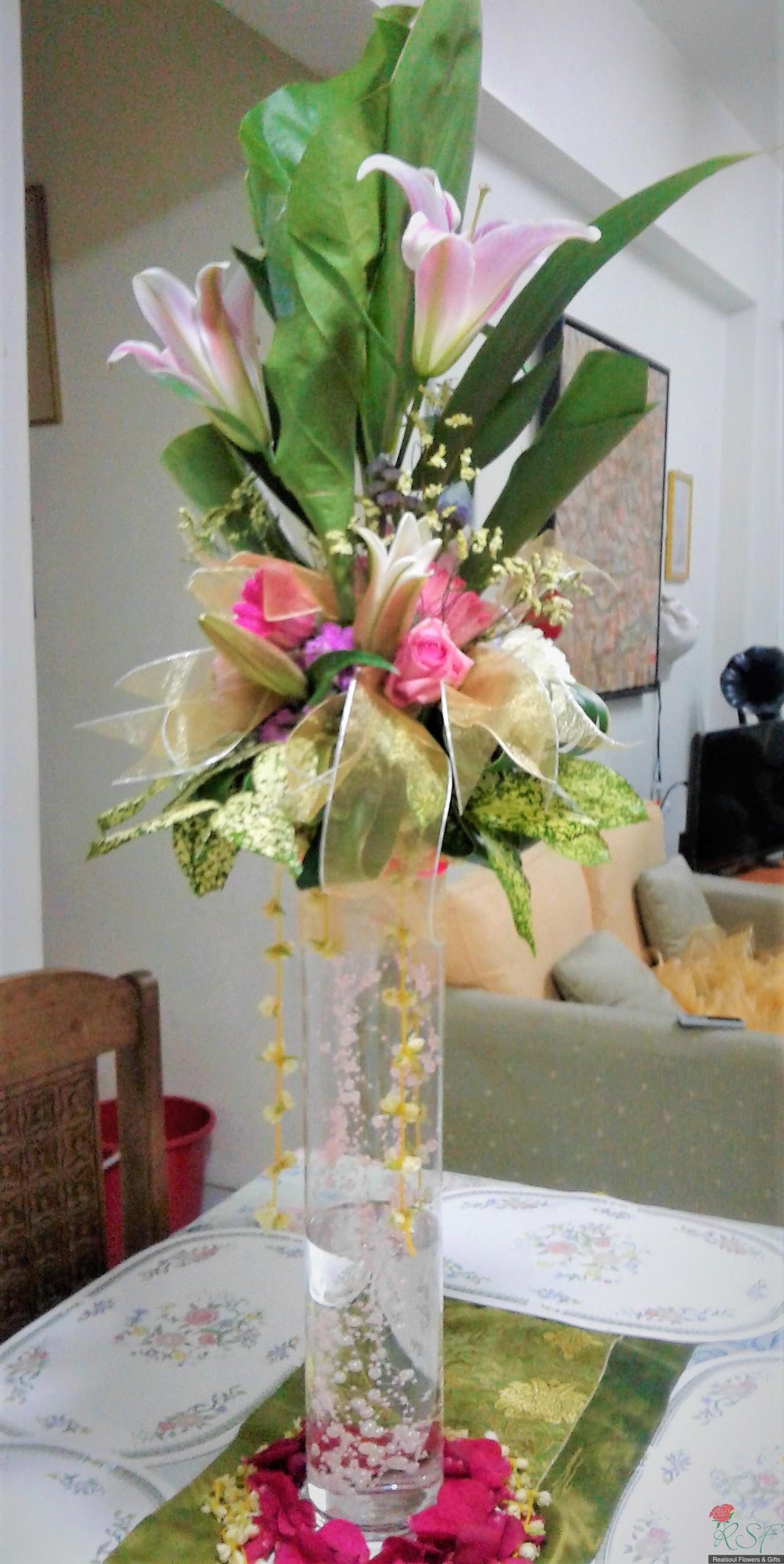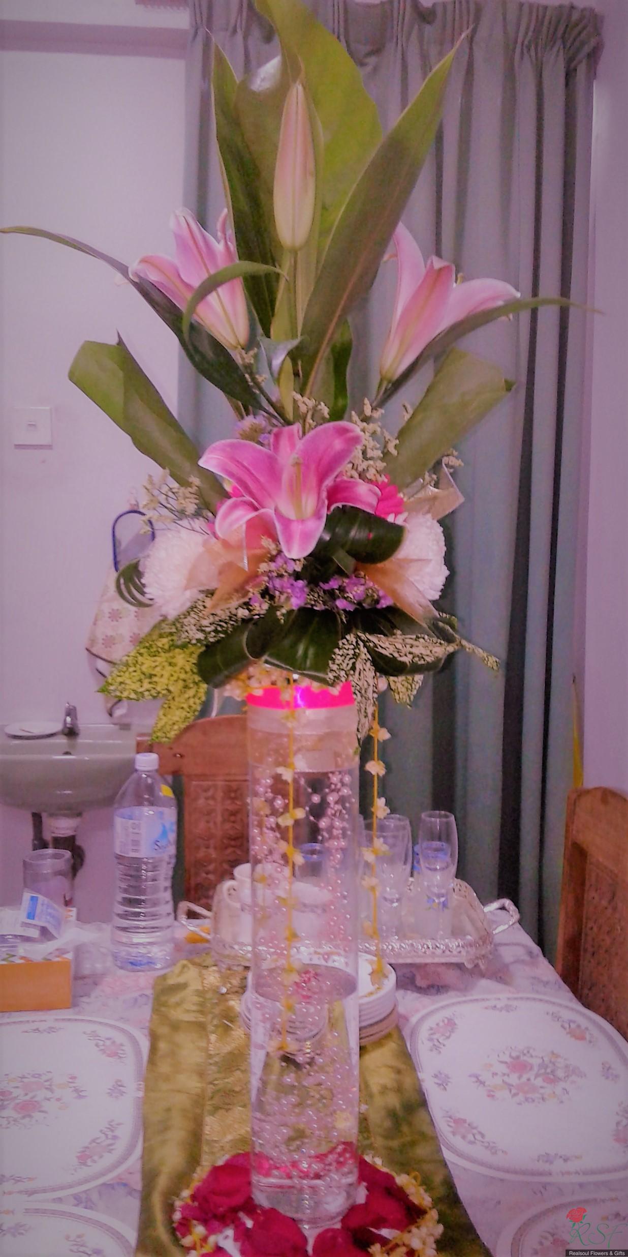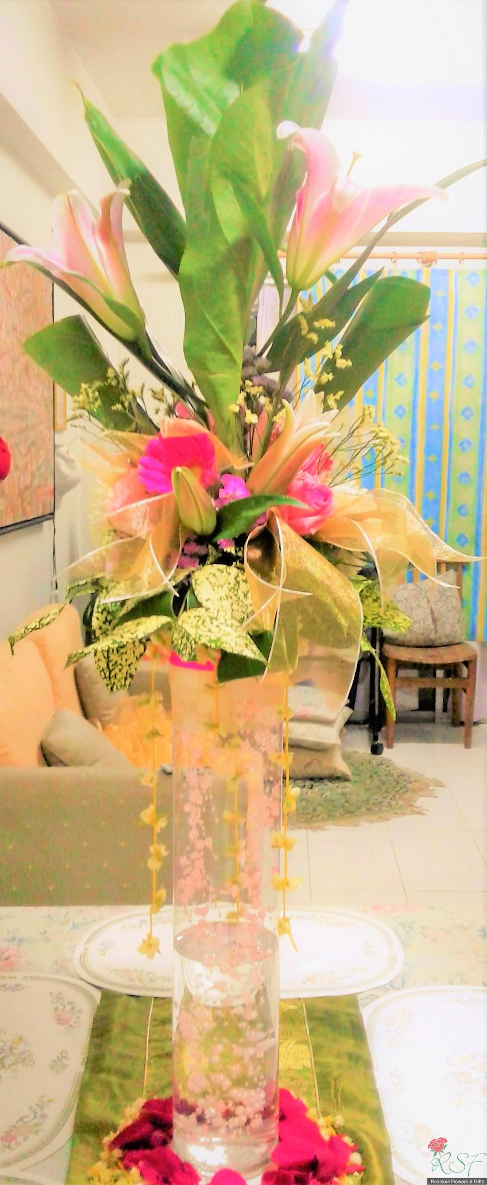 Weddings: This wedding tall centrepiece is unique in that the total height of the whole arrangement is more than 100cm. Sitting in a cylindrical acrylic glass container of 50 cm height, this design consists of lilies, roses, gerbera daisies, chrysanthemums, jasmine strings, statice, caspia, and three kinds of foliages. The container is enhanced by decorative shiny pearls strings, as well as the base is surrounded by red rose petals and stringed jasmines. This exquisite piece is suitable for high ceilinged reception room or hotel ballroom. This design can be for sale or rental. It is priced at RM295 and rental is at 30% lower than original price and containers and enhancers will be taken back leaving the flowers behind.