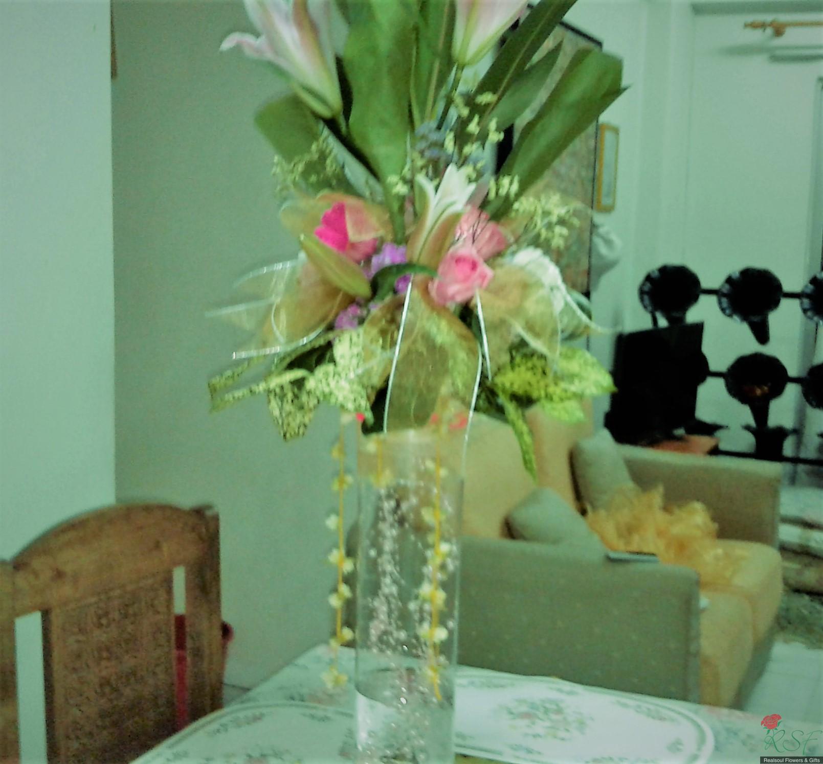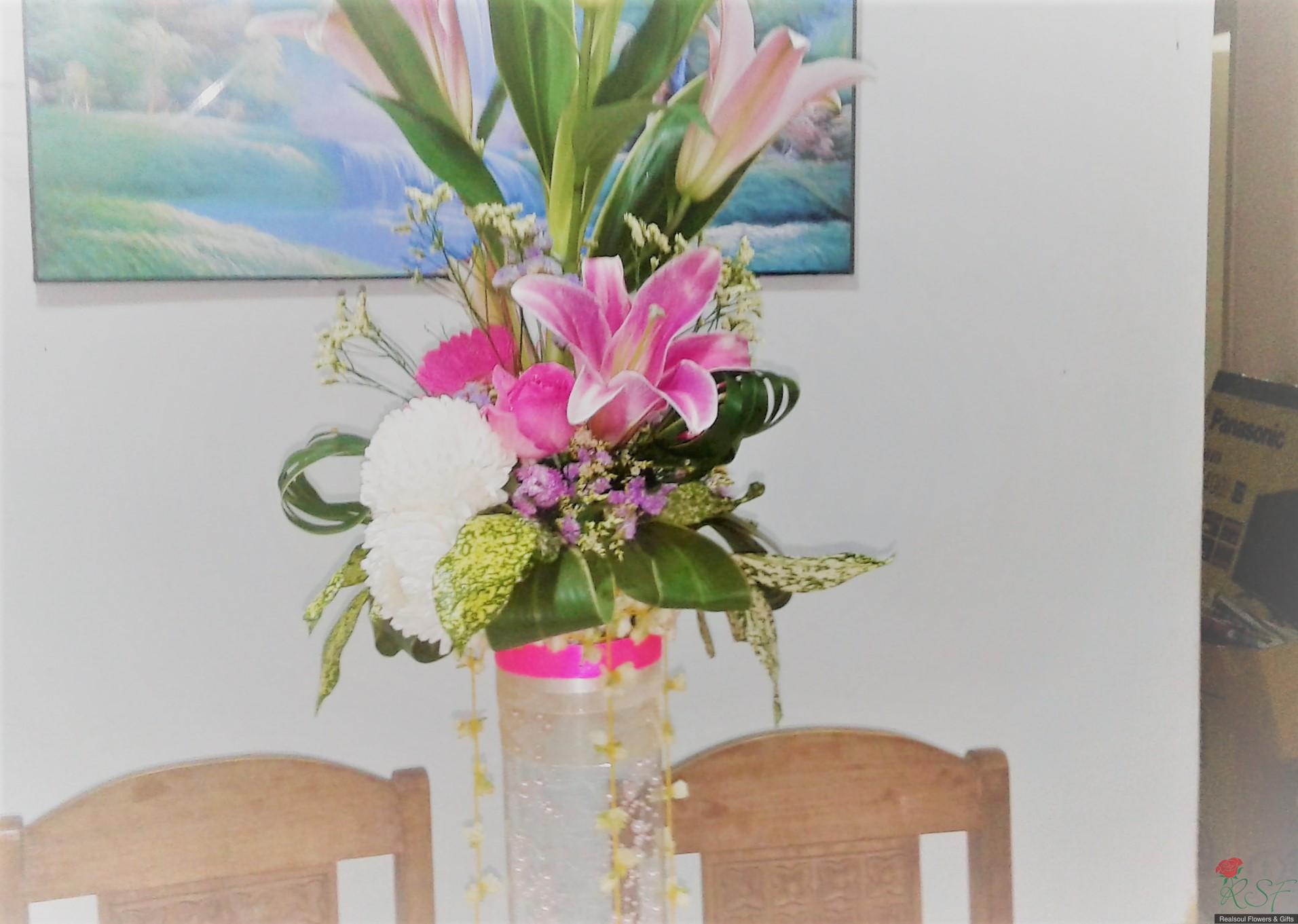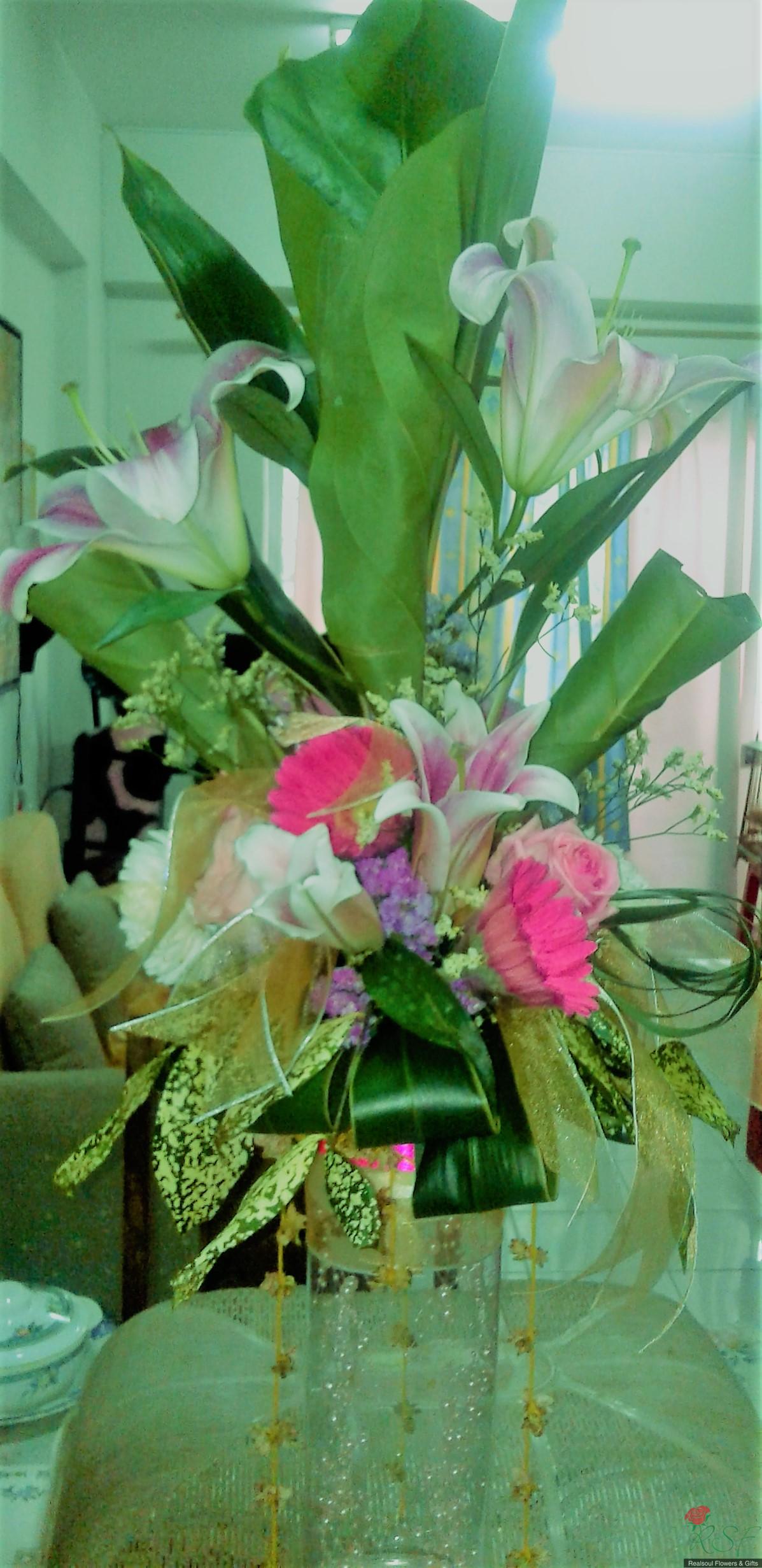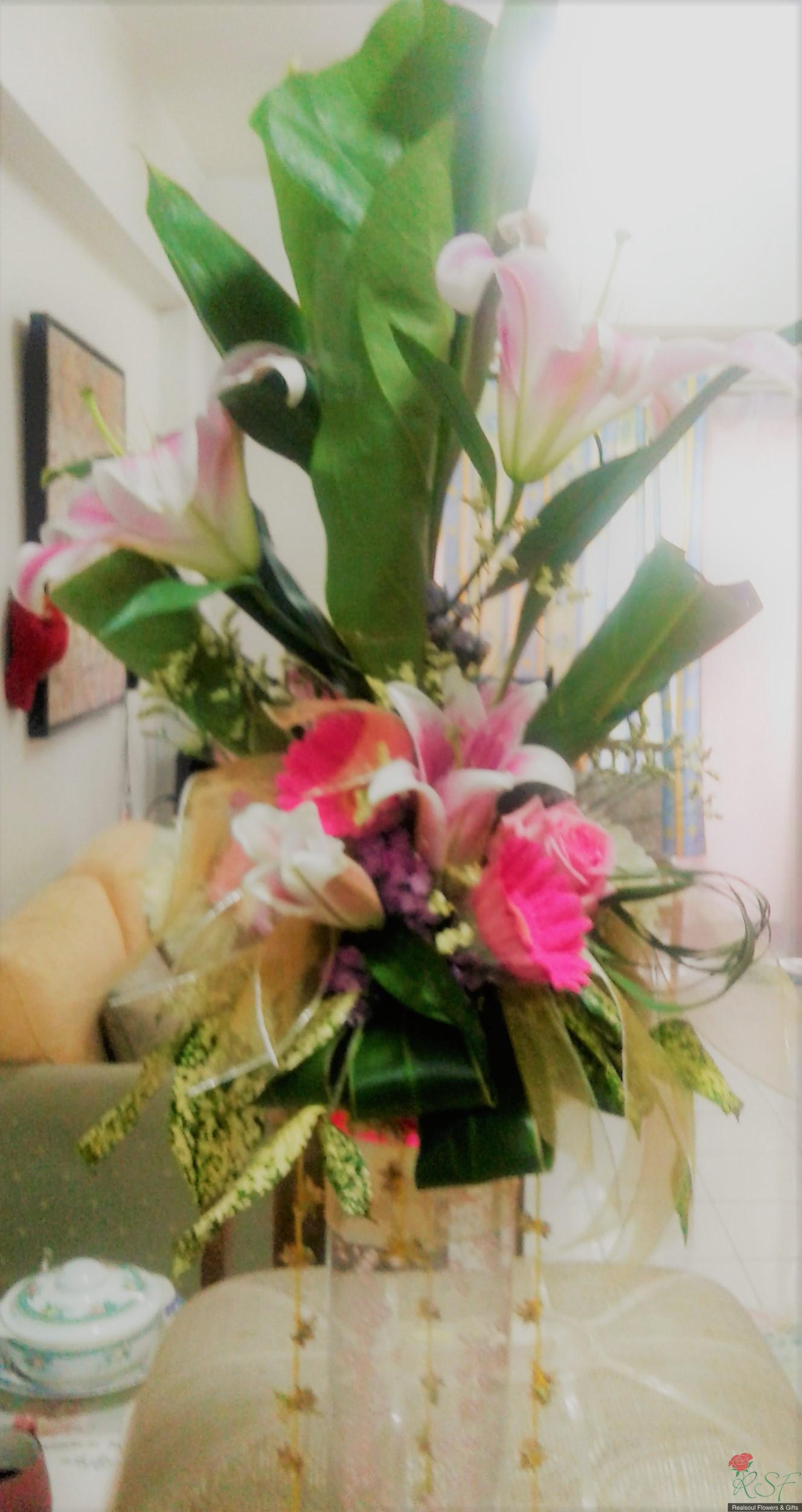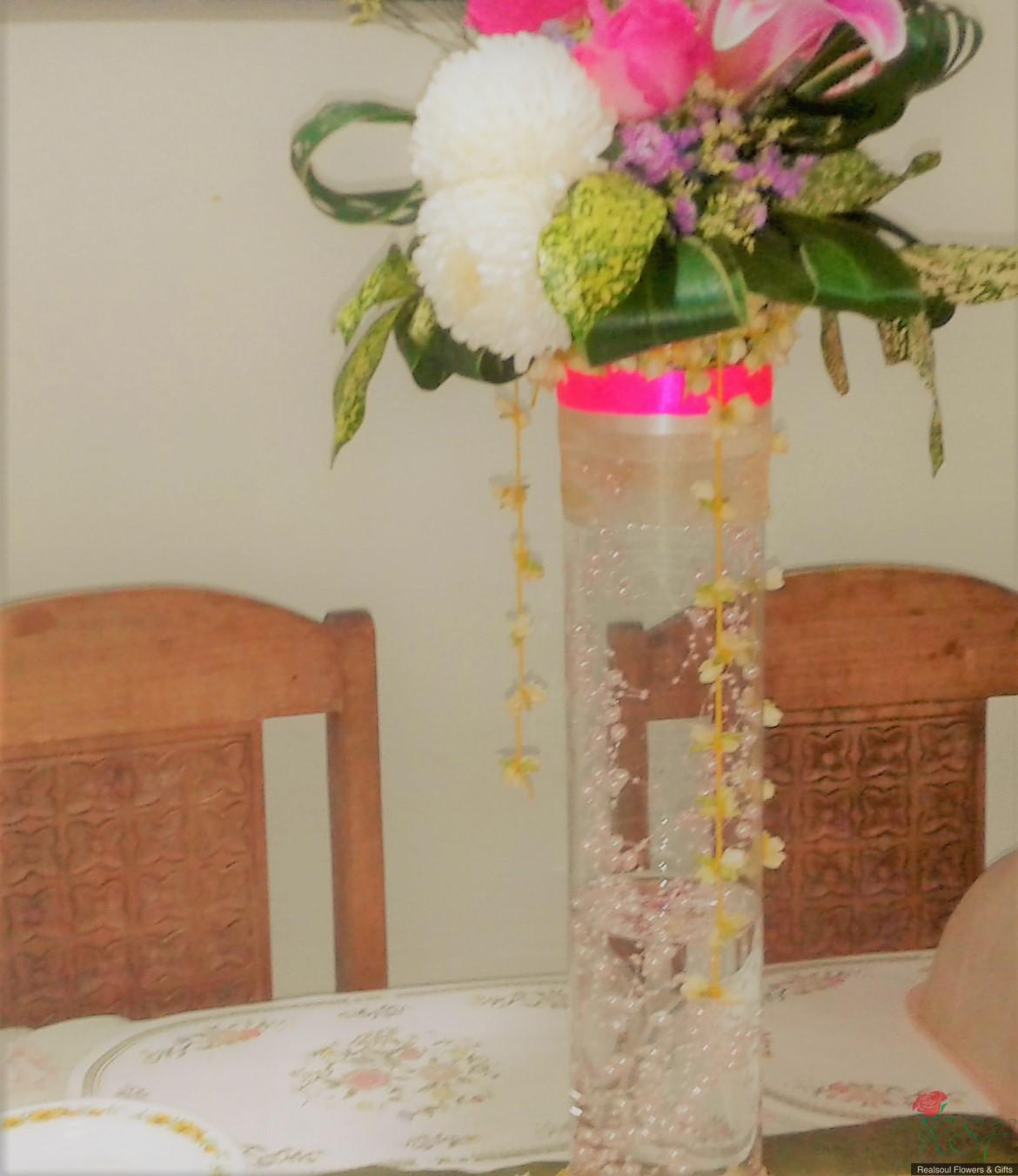 Weddings: This wedding tall centrepiece is unique in that the total height of the whole arrangement is more than 100cm. Sitting in a cylindrical acrylic glass container of 50 cm height, this design consists of lilies, roses, gerbera daisies, chrysanthemums, jasmine strings, statice, caspia, and three kinds of foliages. The container is enhanced by decorative shiny pearls strings, as well as the base is surrounded by red rose petals and stringed jasmines. This exquisite piece is suitable for high ceilinged reception room or hotel ballroom. This design can be for sale or rental. It is priced at RM295 and rental is at 30% lower than original price and containers and enhancers will be taken back leaving the flowers behind.