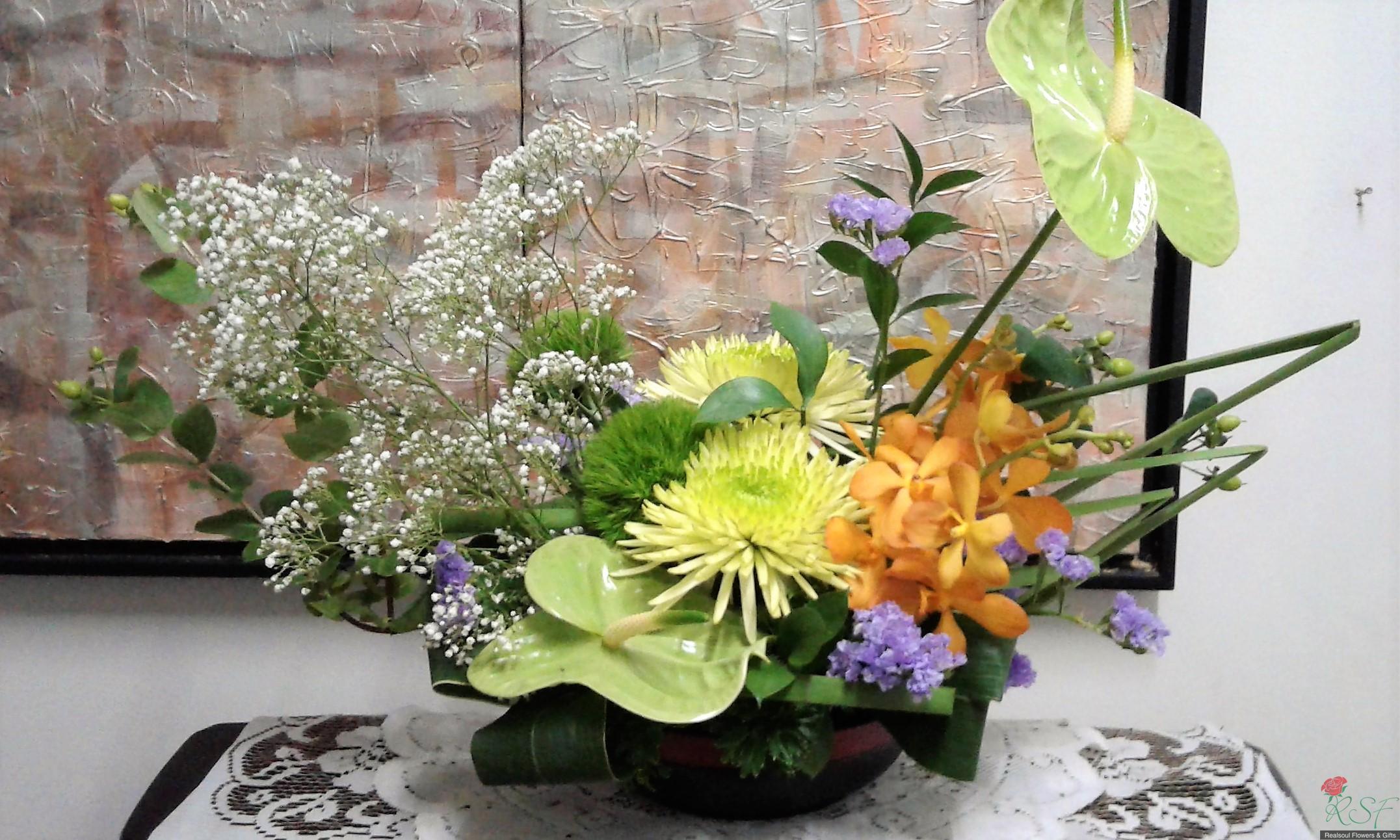 Weddings: Low table centrepiece with green chrysanthemums, orange orchids, babys breath and fillers.