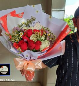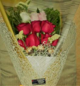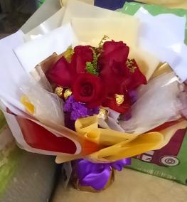 HB 066-Fresh hand bouquet, 7 roses & 5 Ferrero Rocher/Buket tangan ros-Client's review, 2022 "Very nice". SHIP FREE WITHIN 2 KM